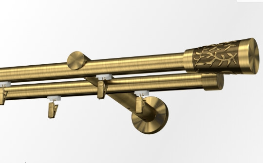 Karnisz podwójny przesuwny z wspornikiem w kolorze mosiądzu antycznego z przedłużką i końcówkami Fenix o długości całkowitej 132 cm w cenie 226.00zł. Zestaw zawiera profile o łącznej długości 120.00 na każdy z torów, wsporniki oraz 12x ślizg z żabką na pierwszy profil i 12x ślizg z żabką na drugi.